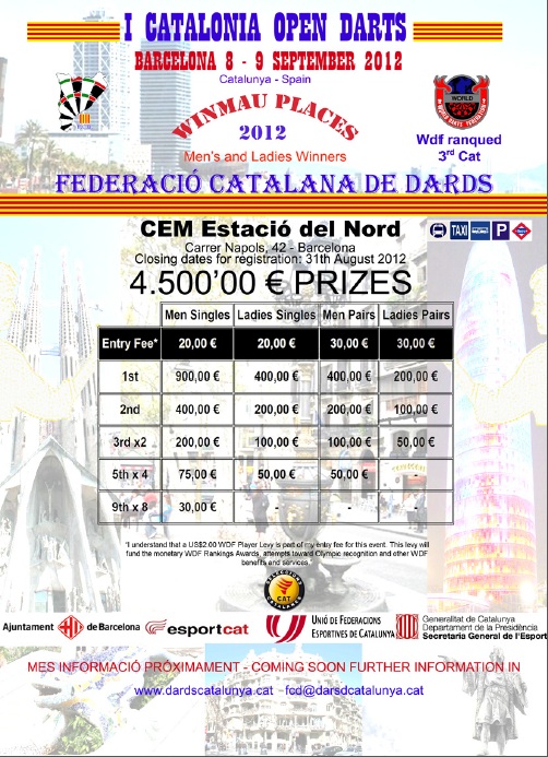 La Federación Catalana de Dardos anuncia el I CATALONIA OPEN DART: el primer campeonato, que se celebra en Catalunya, puntuable para el Ranking de la World Darts Federation (la Federación Mundial de Dardos), con accésits al Winmau World Masters 2012 por los campeones masculinos y femeninos, que además dan acceso a participar en los Play-off clasificatorio para el Lakeside World Profesional Chlampionship 2013.